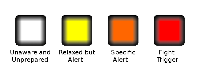 In 1989, Lieutenant Colonel Jeff Cooper, a former US Marine and creator of “the modern technique” of gun fighting, wrote a booked called Principles of Personal Defense and he came up with a color code to indicate the level of awareness a person has.